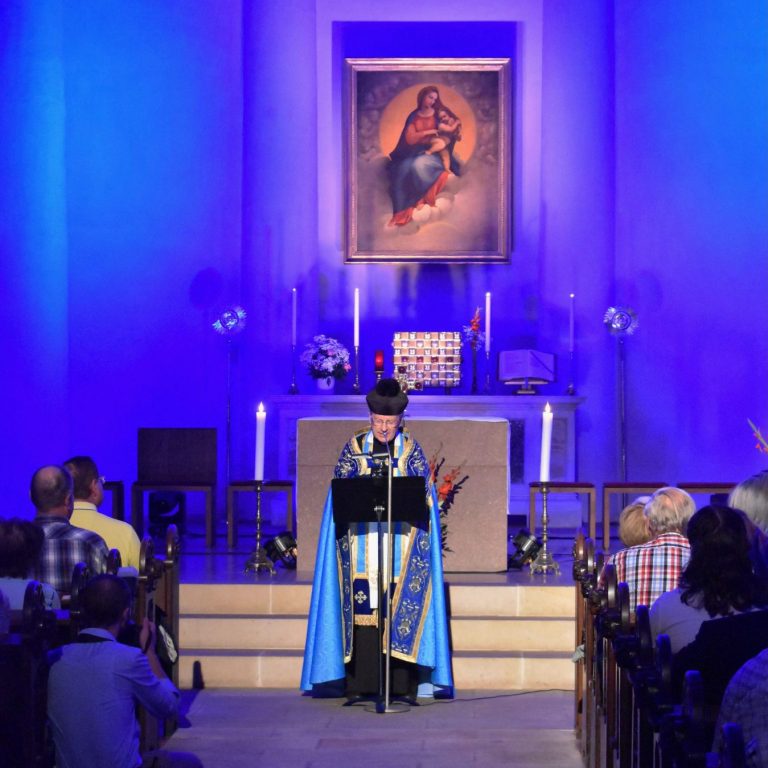 Ein sanftes, flächiges Licht erfüllte das Kirchenschiff, während gezieltes Frontlicht den Pfarrer Armin Kensbock bei seiner Ansprache klar und würdevoll hervorhob.