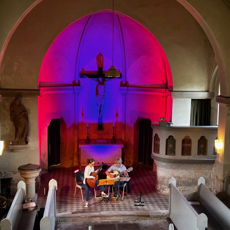 Sanfte Lichtverläufe, warme Farbtöne und dezente Akzente gaben dem Kirchenraum eine ganz eigene Atmosphäre – ruhig, intim und getragen vom Klang der Saiten.